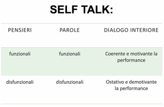 Il self talk si compone di due elementi: pensieri e parole. Pensieri e parole creano un dialogo interiore funzionale nel momento in cui sono coerenti e, di conseguenza, motivano alla performance. D’altra parte, il self talk è disfunzionale quando è ostativo e demotivante per la performance.